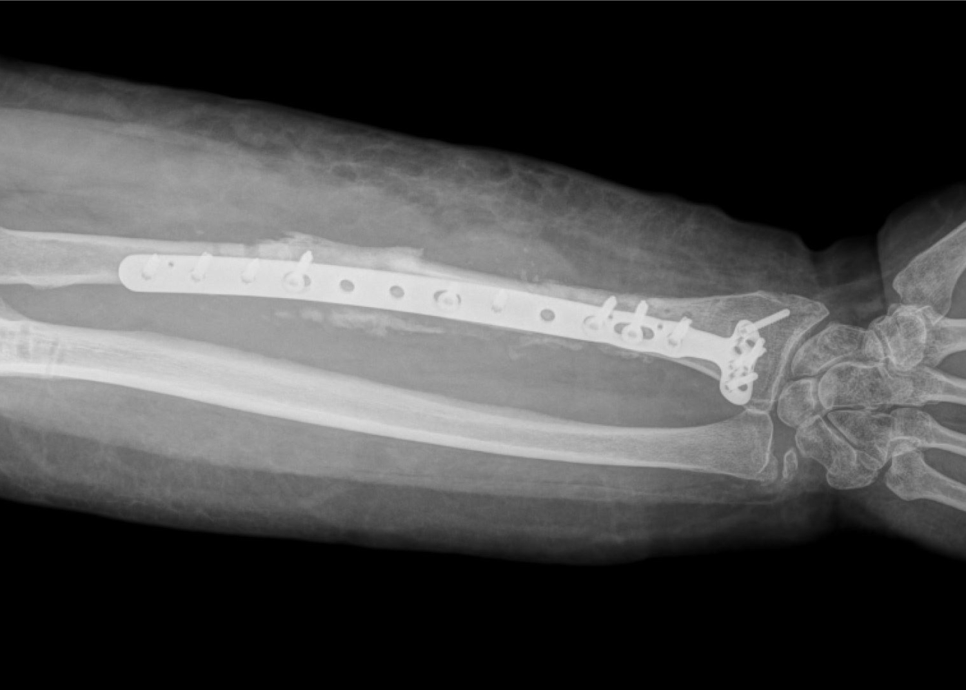 Հիվանդը նշել է, որ դեռևս 18 ամիս առաջ ընկնելու հետևանքով ստացել էր վնասվածք, կատարվել էր վիրահատություն՝ նախաբազկի ոսկրի մետաղական օստեոսինթեզ հարթակով և պտուտակներով։